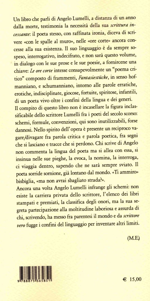 Le ore corte, pubblicato dalle Edizioni Joker (settembre 2025 ) nella collana “I libri dell’Arca”, più che un volume di critica poetica è un libro “a quattro mani” scritto da Angelo Lumelli e Marco Ercolani. La morte non separa le vere amicizie: questo libro, alleato della morte e della vita, è una passeggiata del critico nelle pagine del poeta, non per decifrare significati o modellare ipotesi, ma per ri-trovare lo spirito sospeso e curioso del poeta scomparso che non smette, a un anno dalla morte, di aleggiare sulle nostre nuche come uno sguardo chimerico e interrogativo. Un grazie affettuoso a chi ha supportato questo progetto: Monica Liberatore e Gennaro Fusco, direttori delle edizioni Joker. Il libro è in compagnia delle fotografie di Pietro Bologna, amico di Angelo in vita.
